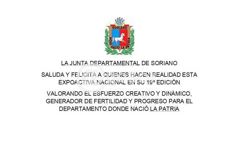 La Junta Departamental de Soriano, saluda y felicita a quienes hacen realidad esta Expoactiva Nacional en su 19a edición, valorando el esfuerzo creativo y dinámico, generador de fertilidad y progreso para el departamento Donde Nació la Patria.