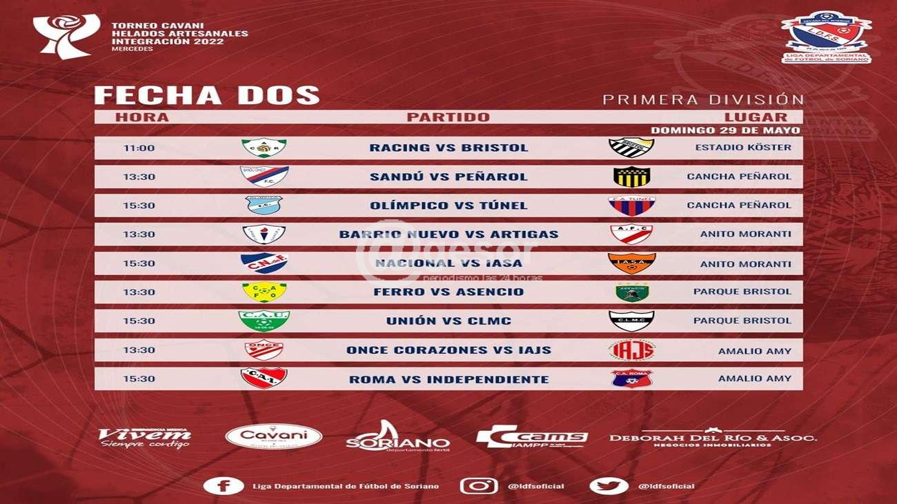 La Liga de Fútbol de Soriano fijó los partidos del fin de semana. Estableció como novedad que habrá 4 árbitros, tanto de los equipos que juegan para evitar abonar multa el día sábado, como de las semifinales el día domingo, dicha medida fue propuesta por el presidente, Dr. Pablo Marrero, &n...